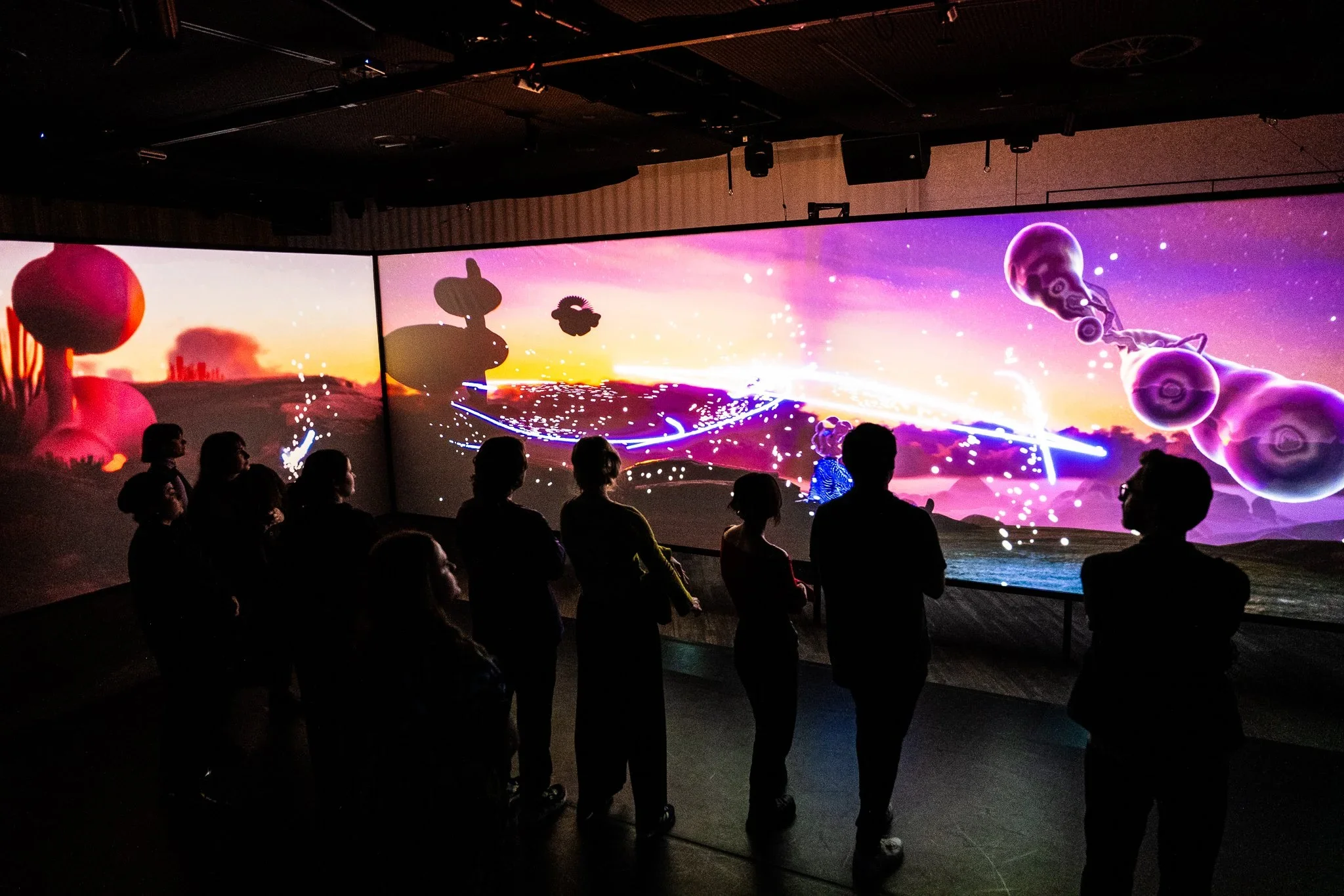 kajoo yannaga (come on let’s walk together) is at once a cinematic story, an immersive two-channel projection and a gamified journey guided by First Nations knowledges. Through real-time motion tracking mapping body movement, connect to place and be transported to a vivid Spirit realm sprinkled with signs and signals for those who look to see. With self-determination and generosity in mind, the completion of each circular story cycle pulls you back to start again. Leave kajoo yannaga with a newfound understanding of our shared responsibilities for united, intergenerational healing.